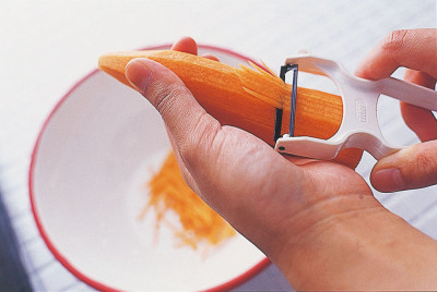 皮をむいたにんじんに、包丁の先で2〜3㎜間隔の切りこみを入れ、奥から手前に向かってピーラーをシャッと引くだけで、形のそろったせん切りが完成!サラダやきんぴらにオススメです。