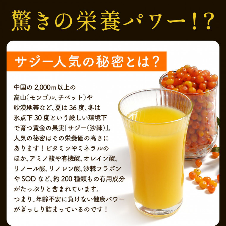 - 中国の2,000m以上の高山(モンゴル、チベット)や砂漠地帯など、夏は36度、冬は氷点下30度という厳しい環境下で育つ黄金の果実「サジー(沙棘)」には、ビタミンC、ビタミンA、ビタミンE、ビタミンB1、ビタミンB2、ビタミンK等の各種自然ビタミンと鉄分、カルシウム、カリウム、亜鉛等のミネラル、16種類のアミノ酸や有機酸、オレイン酸、リノール酸、リノレン酸、さらには、沙棘フラボンやSODなど、約200種類もの生活活性成分が含まれています。