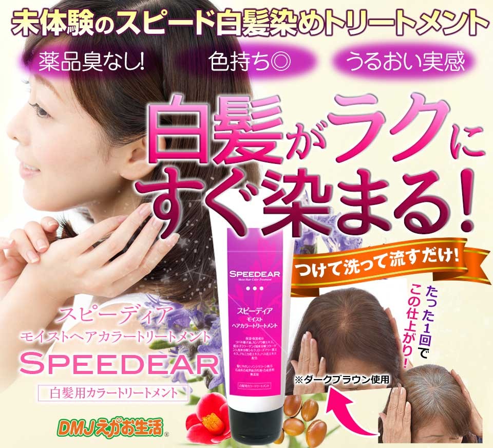 - 30分放置してもなかなか染まらない、色ムラが出てすぐに白髪が目立つ…そんな白髪染めヘアトリートメントの悩みを解消すべく誕生したが「モイストヘアカラートリートメント スピーディア」です。このヘアカラートリートメントは、微アルカリ処方によって染料の定着がグンとアップ。カラートリートメントの塗布時間が5分〜10分目安と素早く手軽に染めることができます(髪質や使用量によって個人差があります)。